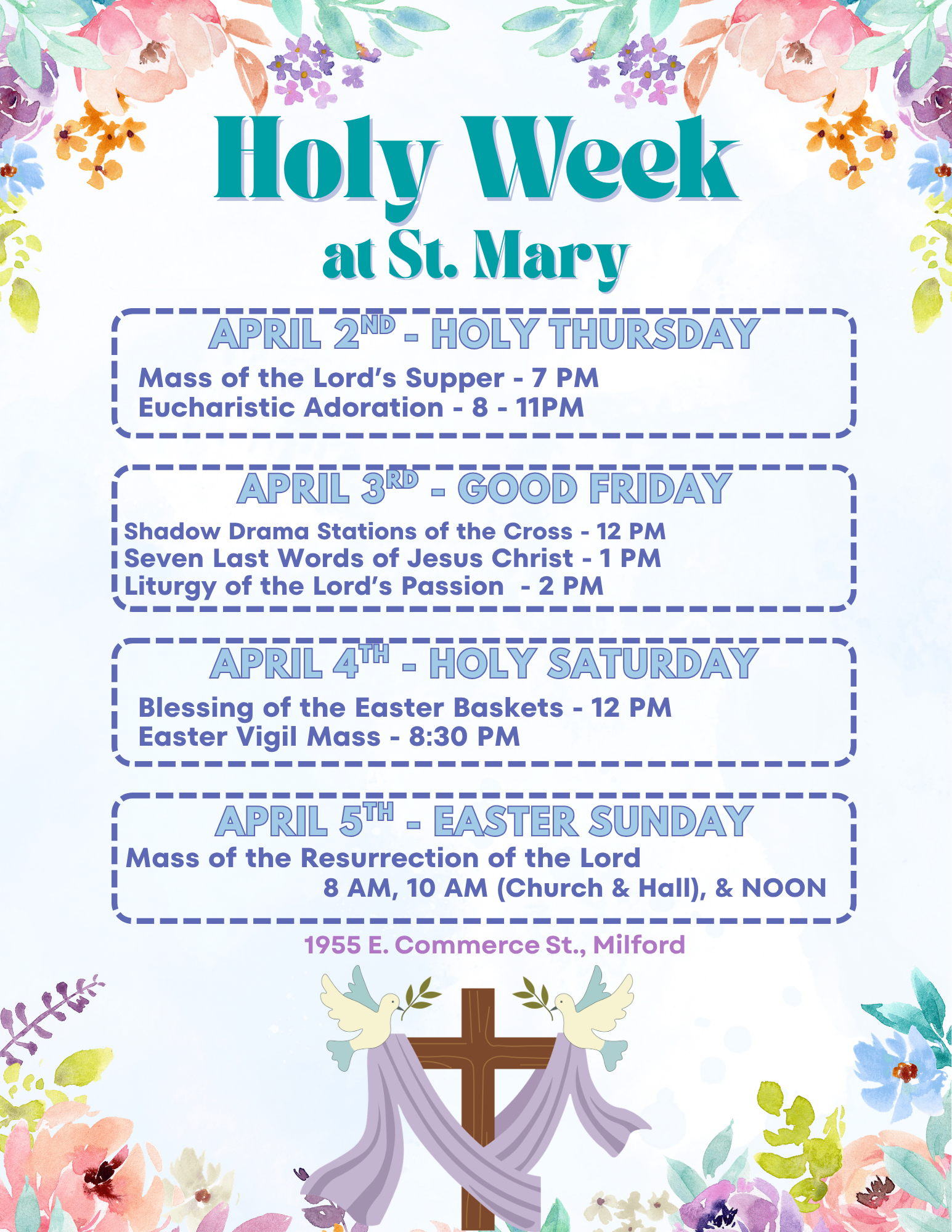 Please join us before our Daily Masses on Monday through Saturday beginning a 1/2 hour prior to Mass for our parishioner led Holy Rosary.