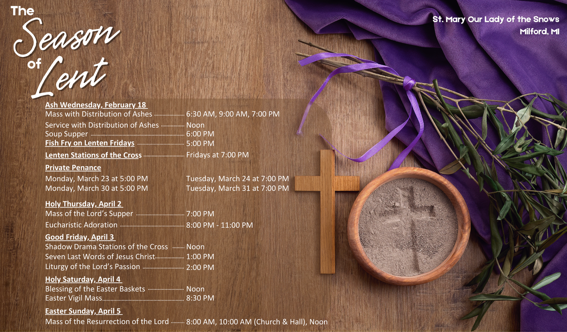 Saturday: 9:00 am and 4:00 pm (excluding Holy Saturday)