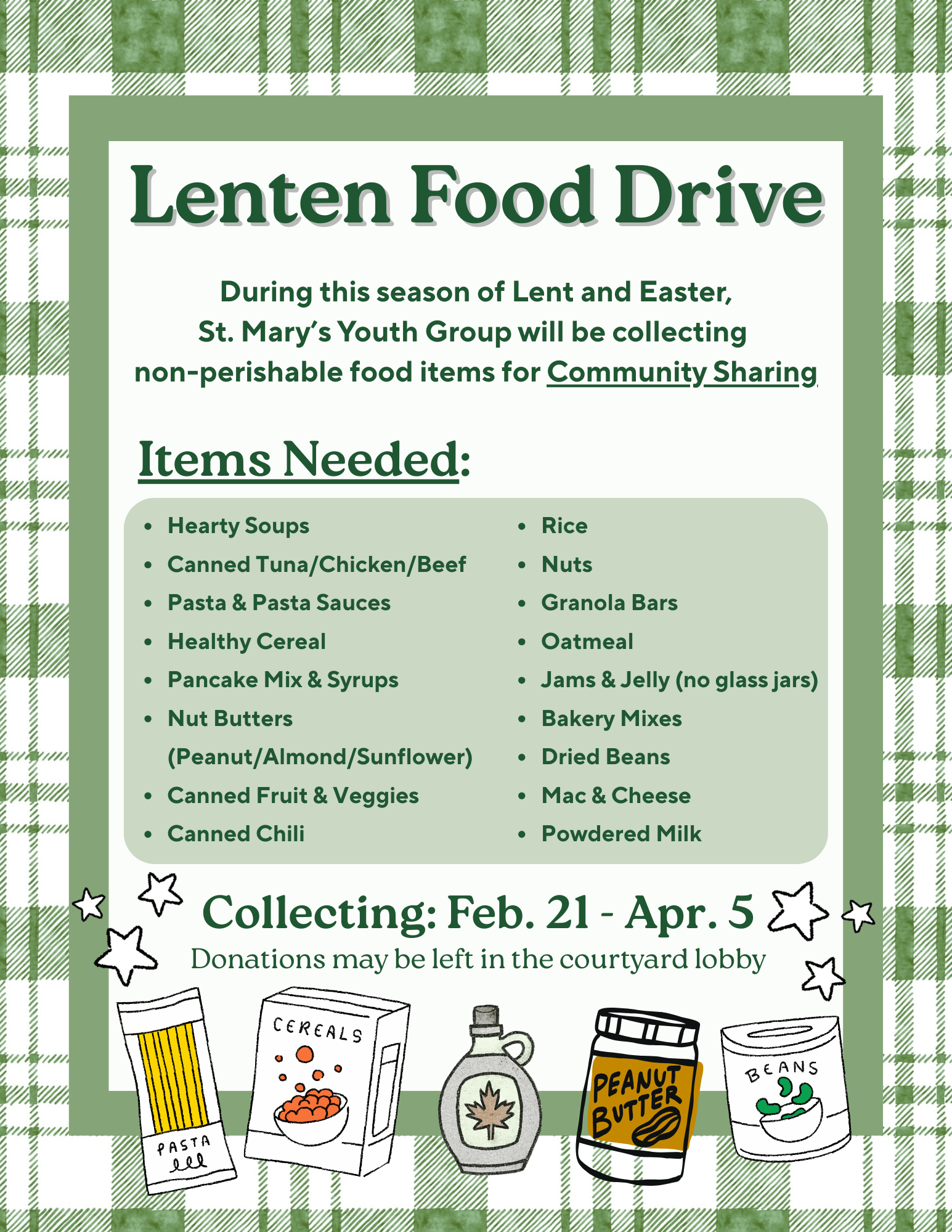 During this season of Lent and Ester, St. Mary's Youth Group is collecting non-perishable food items to support the Community Sharing Outreach Center in Highland! Take a look below to see what items are most in need as donations.