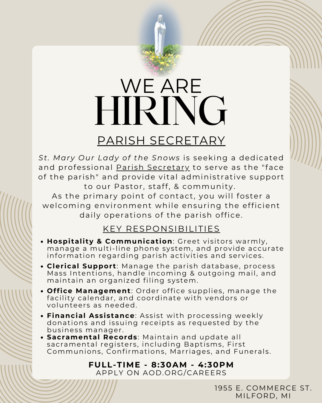 We’re hiring! Are you a multitasking pro with a heart for service? St. Mary Parish is looking for a full-time Parish Secretary to be the welcoming face of our office!